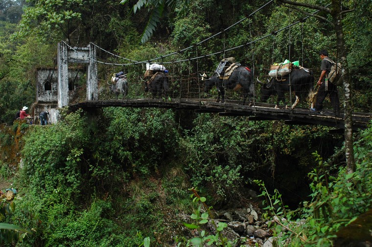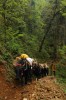 Pierwszego dnia treku pobudka miala byc o 6.30, ale stala sie godzine pozniej. Herbatka do lozka, potem sniadanko (tosty z dzemem i miodem, oraz jakas kaszka) i ruszamy w droge. Kreta, wyboista, ciagnie sie wzdluz stromego zbocza gesto zarosnietej gorki. Z rozstawieniem namiotu na trasie bylby spory problem.
