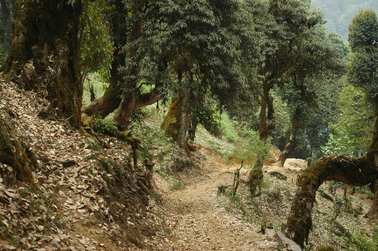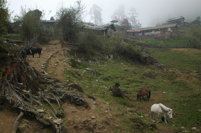 Jest pochmurno, wiec za drzewami nie ma zbytnio widoczkow. Kolo poludnia docieramy do miejsca gdzie ma byc lunch. Tzn. docieraja tam pozostali, jak standardowo gonie swoim tempem przed nimi i zatrzymuje sie dopiero pol godziny dalej. Durji mnie szuka po okolicy, ale mnie tam nie ma, wiec wysyla mi przez przyjaciela paczke z zarciem - dwoma bananami i ciastkami. Czekam na nich z godzine, w konc przychodza. Dorjee przynosi mi troche zupy w termosie przepraszajac najmocniej, ze tak malo. Nie szkodzi, nie jestem jakos strasznie glodny.