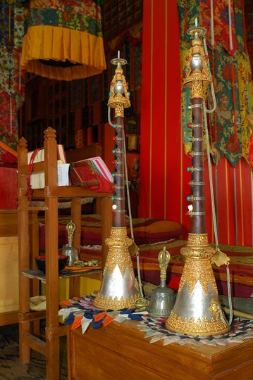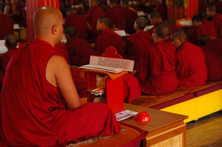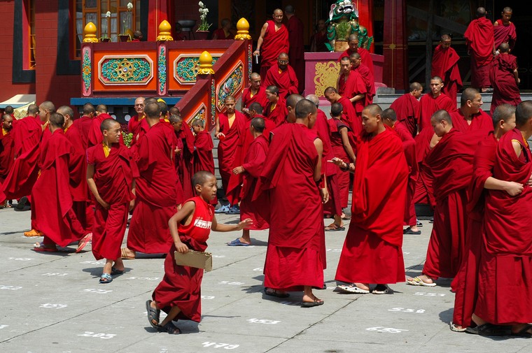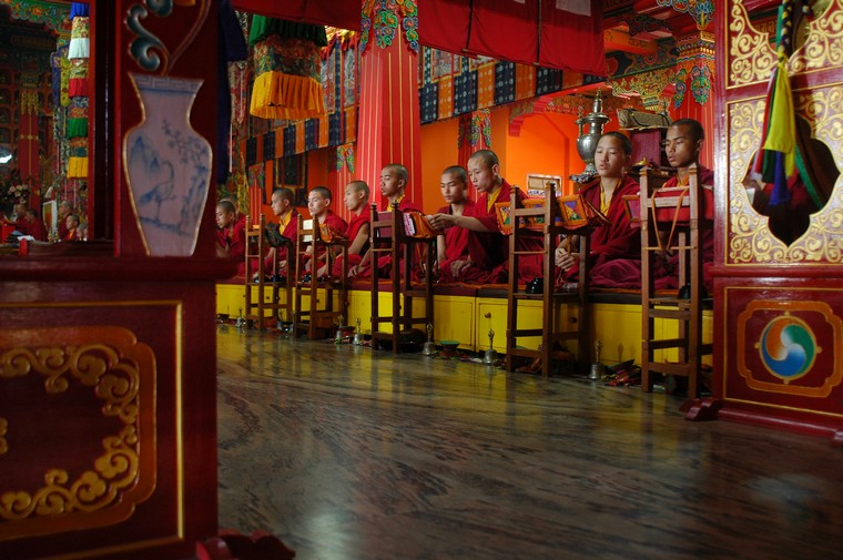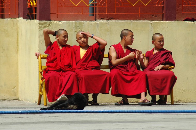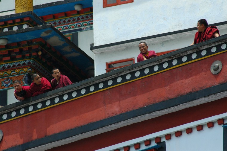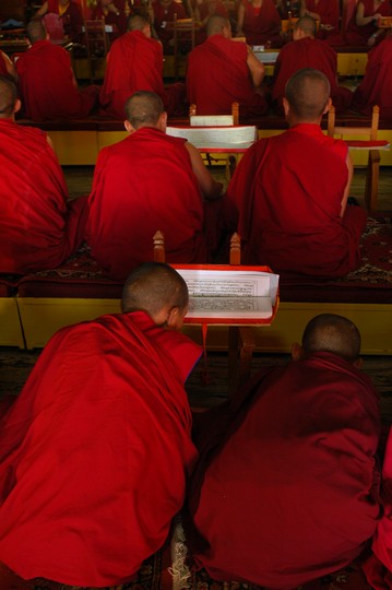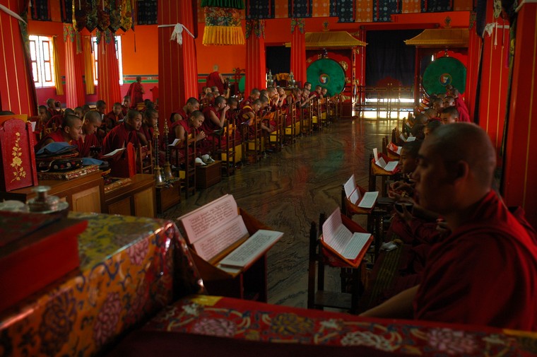 Tudziez, jak glosil napis na bramie wejsciowej, Bokar Ngedhon Choekhor Ling Institute. Jak na razie jedyna z odwiedzonych przeze mnie gomp, w ktorych cos sie dzialo i w ktorych mozna bylo nagrywac wszystko bez krempacji. W ten oto sposob spedzilem tam w sumie z 6 godzin sluchajac jak mnisi robia “mmm mmm mmm mmm”. Co jakis czas elementem przedstawienia bylo rozdawanie posilkow - ciasteczek, chleba, herbaty, na ktore to specjaly mialem przyjemnosc (watpliwa jesli chodzi o herbate, ale moze to jakas tybetanska odmiana byla) sie zalapac.
