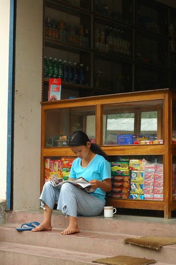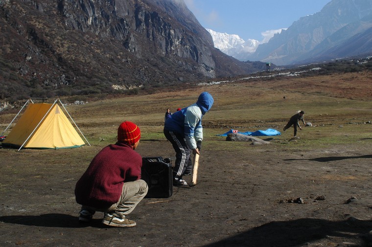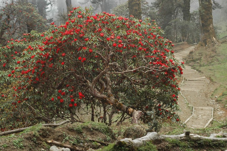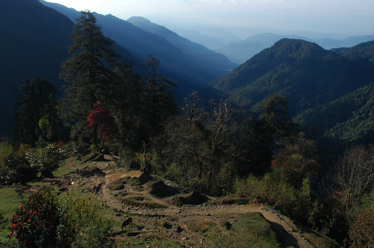 Po paru dniach treku juz sie sam budze przed 6 rano (co nie jest zbytnio trudne jak sie idzie spac o 20ej). Sniadanko i wymarsz z Kukchurung do Tshoka z chlopakami, ktorzy sobie cala droge podspiewuja wesole nepalskie piosenki. W Phedongu (zamglonym poprzednio, zamglonym i teraz) natykamy sie na starsza parke z Belgii, ktora spotkalem wczesniej w Rumteku. Po godzince gadki, czy raczej monologu Belga, ruszamy dalej w dol. Pare fotek rodedodendronow po drodze i jestesmy na miejscu. Jest dopiero jakas 13a, wiec mamy czas na bamboo i na powylegiwanie sie na materacu.
