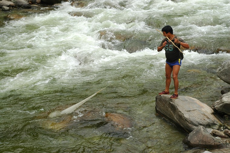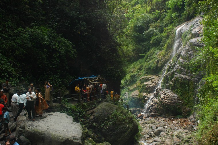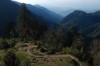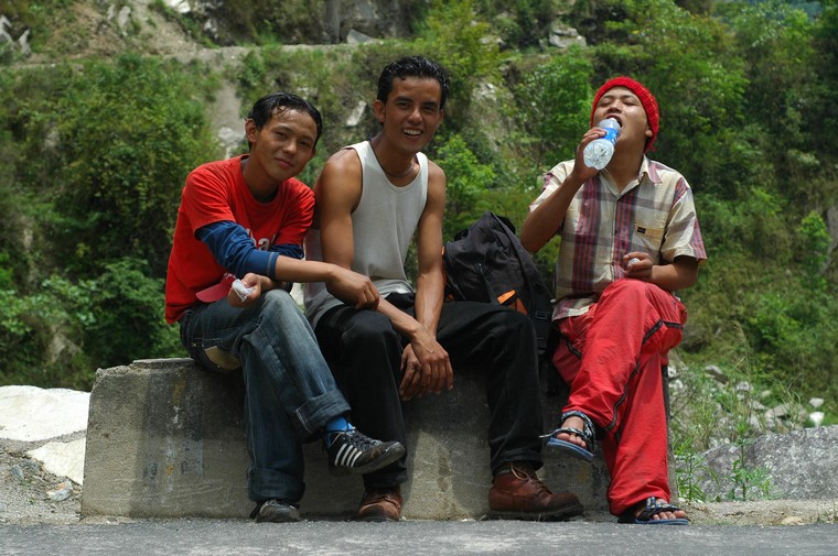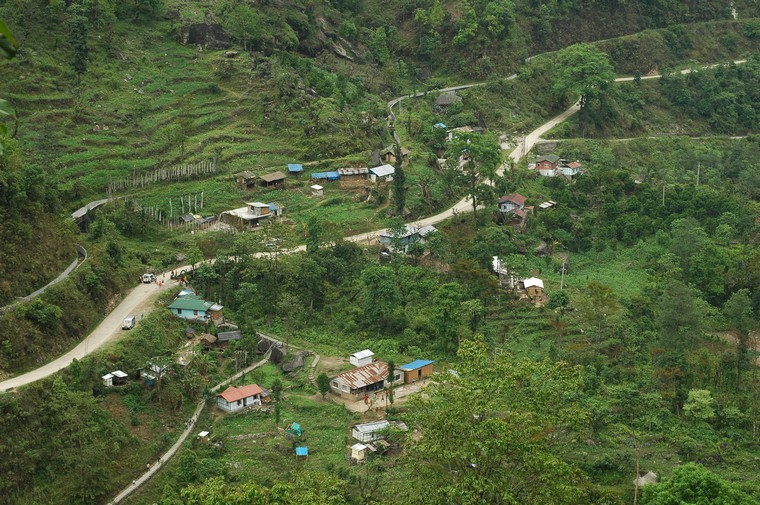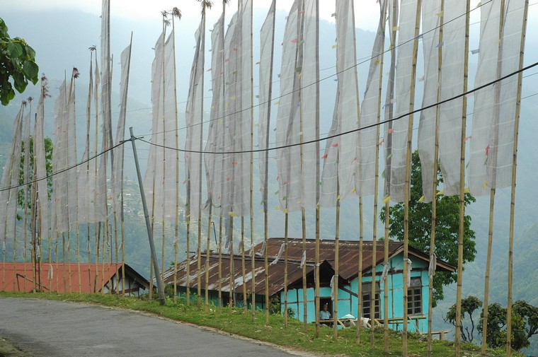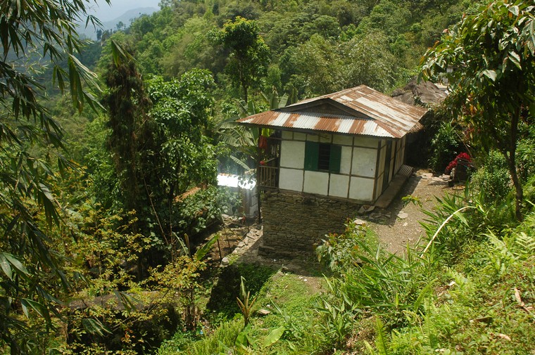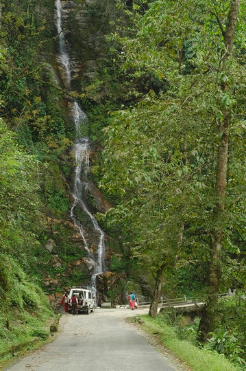 Najpierw lecimy malym skrocikiem w dol, scinajac jakies 2km szosy (z ponad 30 calej trasy), potem kilkanascie kilometrow lepsza lub gorsza (w niektorych miejscach remontowana) szosa do Ribmiku, mijajac Kangczendzoga Falls. W Rimbiku mamy juz dosc ulicy, wiec szukamy kolejnego skrotu, zaraz za jeszcze jednym milym wodospadzikiem. Skrocik jest niezly, bo na oko skracamy droge o conajmniej 5km. Leci prosto pod gorke, w niektorych miejscach pomiedzy krzaczorami sa schody ulozone z kamieni, przetaczamy sie przez pare gospodarstw oddalonych od siebie o jakies 30m (w pionie). Ludzie sie gapia jakby nigdy nie widzieli turysty, co jest dosyc prawdopodobne, bo raczej malo kto sie ta trasa przechadza. Za to przy wodospadach i innych ciekawszych miejscach jest pelno jeepow zaladowanych weekendowymi bengalczykami.