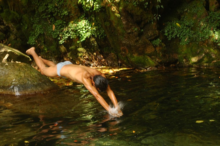 Ostatni dzien to trasa taka sama jak na poczatku, tylko, ze chyba pogoda troche ladniejsza. Slonce grzeje, troche sie spieklem, na szczescie w polowie drogi pod jednym z mostow jest wodospadzik z malym bajorkiem (z tego miejsca ponoc jakis turysta spadl byl i sie rozbil 100 metrow nizej), pluskamy sie w wodzie, jemy obiad, machamy ludziom na moscie itd. Koniec podrozy, w koncu wracamy do cywilizacji, do czystej poscieli (do jakiejkolwiek poscieli), prysznica… Bamboo i idziem spac. Prawie koniec wycieczki.